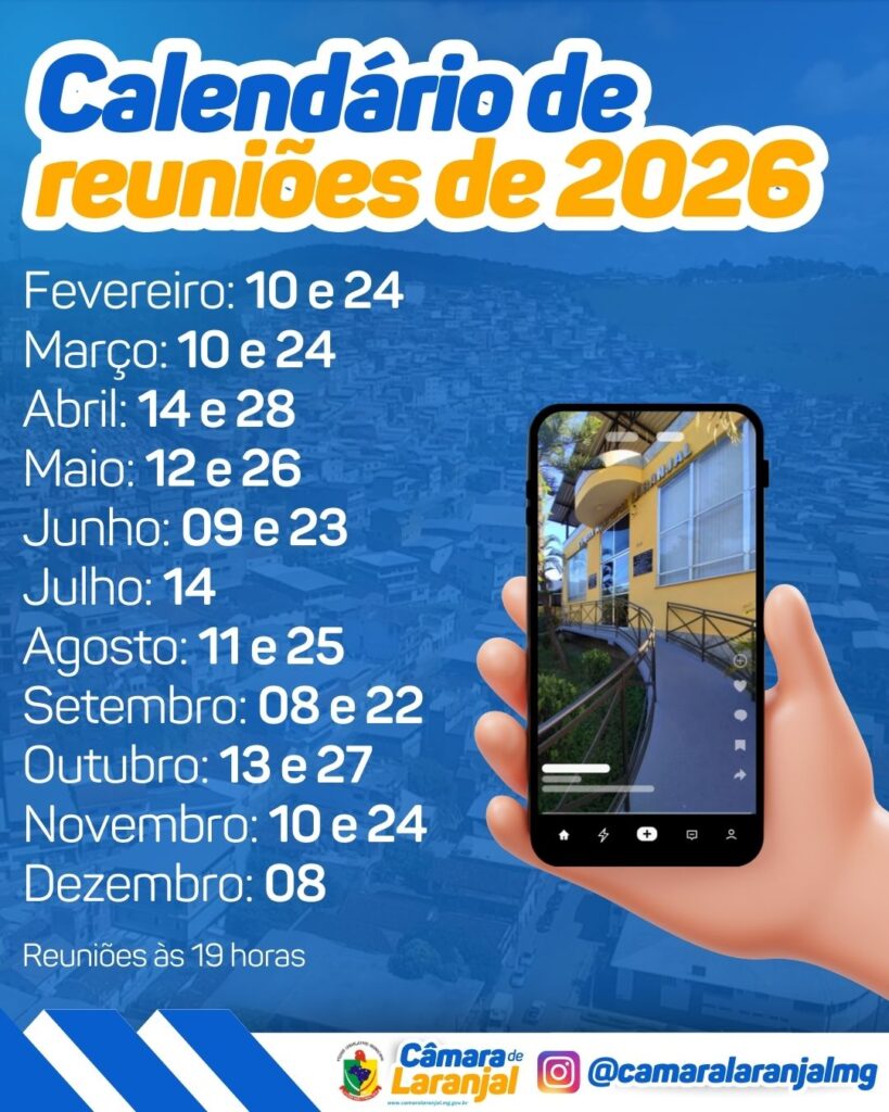 As reuniões ordinárias na Câmara Municipal de Laranjal acontecem duas terça-feiras por mês, sempre na segunda e quarta semanas.