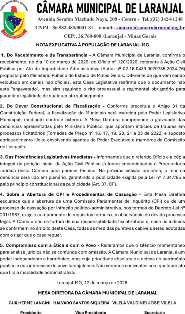 📢 NOTA EXPLICATIVA À POPULAÇÃO DE LARANJAL-MG